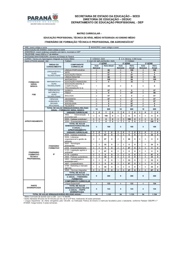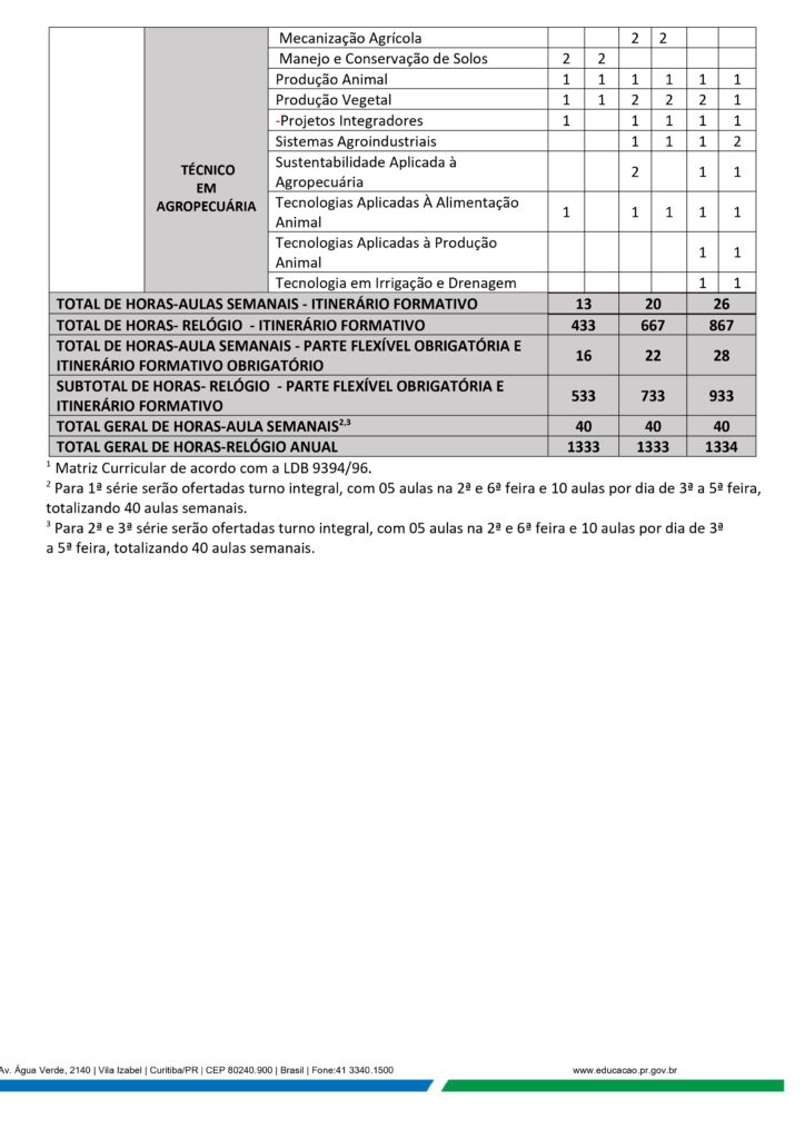 Técnico em Agropecuária – 1ºs e 2º anos – MATRIZ