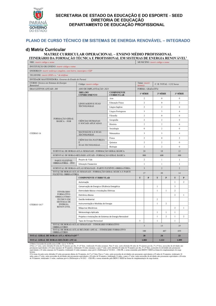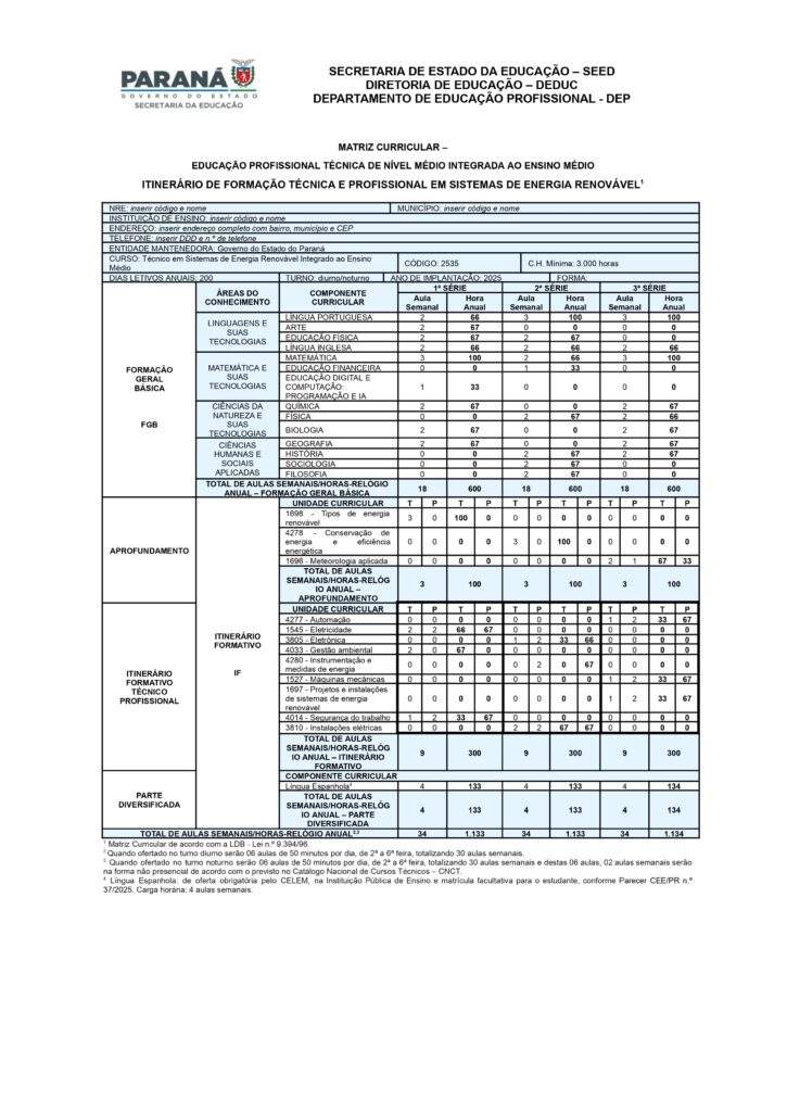 Técnico em Sistemas de Energia Renovável – 1ºs e 2ºs anos – MATRIZ